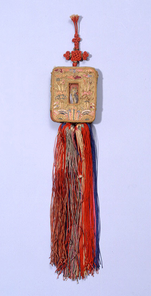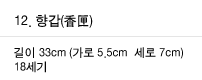 | 향갑을 주체 (主體)로 하여 만든 노리개이다. 이 노리개는 영지와 산, 구름 연꽃 등의 길상문을 수놓아 장식한 향갑(香匣)과 딸기술로 구성되어 있다. 이 향갑 역시 연두색에 가장자리는 금사(金絲) 징금수가 놓여 있다. 한가운데가 작은 창처럼 뚫려 있어 안쪽의 황석(黃石)이 노출되어 있으며 그 위에 호랑이 상이 화각(華角)되어 있다. 일반적으로 호랑이는 액을 막는 ?邪의 의미를 지니는 동물이다. 이러한 의미에서 호랑이는 民畵 등에 등장하는 주요한 소재로 쓰이기도 하였다.