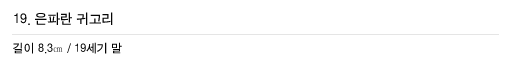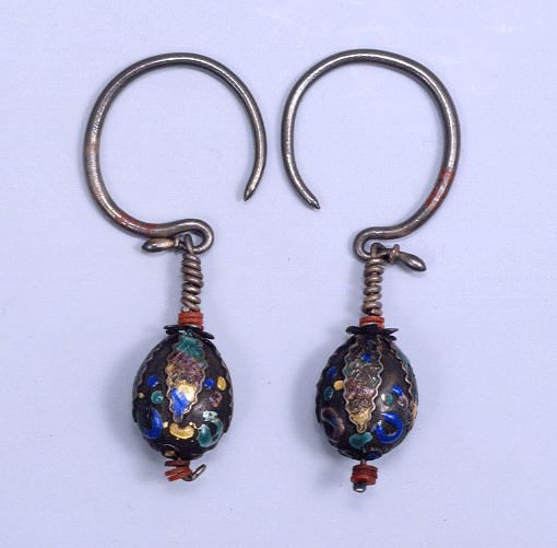 | 귀에 거는 장신구이다 . 귓불을 뚫어 꿰는 방법과 귓바퀴에 걸어 장식하는 두 가지 방식이 있다. 조선시대에는 남녀를 불문, 널리 사용되는 장신구였으나 신체를 훼상하는 것이 유교적 효(孝)의 논리에 어긋나는 일이라 하여 선조(宣祖) 5년(1572)에 금령(禁令)이 내려졌다. 이후 사대부가의 남성은 물론 여성들도 귀를 뚫는 풍속을 버리고 귀에 거는 형태의 귀걸이를 佩用하였다. 그러나 귓불을 뚫어 귀고리를 하는 습속이 완전히 사라진 것은 아니었다. 이 귀고리는 은으로 만든 복숭아(天桃) 위에 세부 문양을 파란(琺瑯)으로 채색해 장식한 것이다. 천도(天桃)는 長壽를 상징한다.