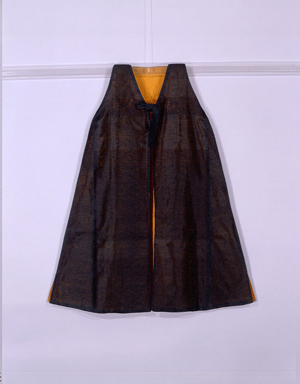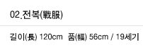 | 조선시대 武官들이 겉옷 위에 덧입는 소매 (袖)없는 옷으로 주로 軍服으로 이용되었다. 소매 뿐만 아니라 깃(?)이 없으며 등솔기와 양쪽 옆선이 트여 있다. 무관들이 전복을 입을 때에는 동달이를 입고 남색 전대(纏帶)를 띠었다. 文官이 이 옷을 입을 때에는 주로 포(袍) 위에 착용하고 술띠를 매어 입었다. 이 전복의 겉감은 검은색 국화문사(菊花紋紗)이며 안감은 주황색 평직(平織) 명주(明紬)이다. 여밈은 맞깃형식이다. 여기에 도안된 菊花紋은 長壽와 繁榮, 君子의 志操를 상징한다.