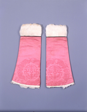 토시는 추위나 더위를 막기 위해 팔목에 끼는 물건이다 . 防寒用 토시는 안에 솜을 대고 防暑用일 경우 가늘게 찢은 대오리를 엮어 만든다. 수구(袖口)에 토끼털을 대어 장식과 보온의 효과를 더했다. 문단 표면에는 원형(圓形)의 '壽'字 문양이 있고 그 주변을 다섯 마리의 박쥐가 에워 싼 형상이다. 박쥐는 편복이라 표기하는데 '福'과 음이 같아 복과 행운을 상징한다. 다섯 마리의 박쥐는 오복(五福)을 의미한다. 오복은 흔히 수(壽)·부(富)·강녕(康寧)·유호덕(攸好德)·고종명(考終命)의 다섯 가지를 말한다. |