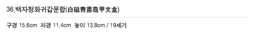 | 원통형 (圓筒形)의 몸체에 윗짝과 아래짝으로 이루어진 합(盒)으로, 윗짝은 상면(上面)중앙에 원각(圓刻)이 깎여져 있고 어깨로부터 비스듬히 넓어지다 세워져 뚜껑으로 쓰였으며 아래짝은 이중의 구연(口緣)을 이루고, 저부에서 좁혀져 넓고 낮은 굽다리를 이룬 발(鉢)의 모습을 이루고 있다. 문양은 코발트 안료로 몸 전체에 龜甲 문양을, 뚜껑의 상면 중앙에는 ‘壽’명(銘)을 도안화하여 굵은 필치로 그려 나타내었다. 유색(釉色)은 담청(淡靑)을 머금은 백자유(白磁釉)이다. 거북은 원래 吉祥적 의미로 십장생의 하나이기도 하며 일반적으로 귀갑은 앞날의 길흉과 운세를 점치는 데 사용되기도 한다.