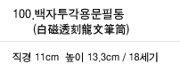 | 원통형 필통 기형으로 몸체에는 용무늬가 투각되고 음각과 양각으로 세부가 표현된 순백자이다 . 전면 시유된 백자유는 회청색을 띠고 있고 용융 상태는 양호하다. 순백 백토면 위에 복잡한 용무늬를 정교하게 뚫고 새긴 조각 솜씨가 놀라운데, 분원에서 제작했을 것으로 보인다. 백자 문방구류는 18세기 후반에 이르러 제작이 활발해져 종류나 형태, 장식 수법이 다양해졌는데, 19세기 이르러 폭발적으로 증가했다. 특히 다채로운 형태의 필통들이 제작되어 쓰임과 더불어 완상용으로 만들어진 것과 같은 장식성을 지니게 되었다.