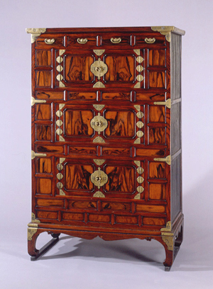 전체 구조는 目자 모양을 이루고 아랫단에 풍혈을 새긴 마대 (馬臺)가 받치고 있다. 천판(天板) 밑은 4개의 서랍으로 꾸며져서 편복(??) 들쇠장식이 각각 붙었고, 사이사이에 각기 여닫이 문판이 있다. 가장 아랫단은 2단으로 꾸며졌고, 그 아래 馬臺가 설치된 형상이다. 자물쇠 앞바탕에는 菱花刑에 만자(卍字)무늬가 투각되어 있고 또한 경첩과 귀장식 등도 菱花형으로 꾸며졌다. 서랍 내부 판재는 소나무(松)판을 썼다.