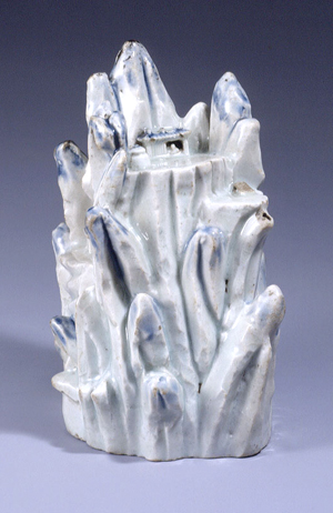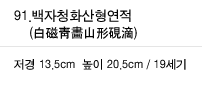 | 유약을 닦아낸 편평한 바닥 위에 큼직하고 둔중한 산의 형태로 조각한 연적 기형이다 . 산 정상과 중턱 두 곳에 절간(寺刹)과 같은 형태를 조각했고, 산봉우리마다 청화를 칠했으며, 물이 들어가고 나오는 구멍은 산봉우리 끝에 두 곳 배치했다. 장식적 효과가 두드러지는 이 연적은 산봉우리 사이, 단순화 시켜 조각한 절 안에 수도승의 모습을 표현하고 있어 세심한 면도 보이고 있다. 이와 같은 분위기의 산경(山景)은 대체로 金剛山으로 보고 있는데, 금강산 소재는 조선 말기 연적으로 종종 등장했다. 금강산은 일반적으로 佛敎的 靈地로 알려져 있다.