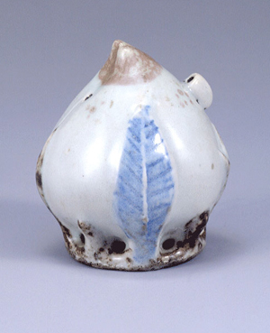 | 둥글게 말은 나뭇가지를 받침 삼아 잎사귀가 붙은 복숭아를 얹은 모양으로 만든 연적 기형이다 . 청화와 진사 안료가 잎과 가지, 그리고 복숭아 끝을 장식했고, 음각으로 복숭아 양옆에 붙은 잎사귀의 잎맥도 묘사했다. 물이 들어가고 나오는 구멍은 상단부에 두 곳 두었으며, 전면 시유된 회청색 백자유의 용융상태는 양호하다. 이와 같은 복숭아형 연적은 고려시대부터 만들어졌으나 조선 후기에 들어와 많이 제작되면서 모양과 장식이 다채로워졌다. 복숭아는 천도(天桃)를 상징하고 있는데, 전설상의 인물인 동방삭(東方朔)과 관련되어 장수를 의미하고 있다.