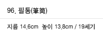 필통은 주로 붓을 꽂아두는 용도로 사용된다 . 다양한 형태의 필통이 있지만 이 필통은 통나무를 갈이기계로 깎아 圓筒모양을 만들어서 바깥쪽에는 사면에 「囍」자를 양각한 圓廓을 배치하여 장식하고 칠을 입혔다. 자연 그대로의 나무를 이용하여 겉표면만 다듬고 몸통과 밑바닥은 서로 맞추어 끼워 제작하였다.
