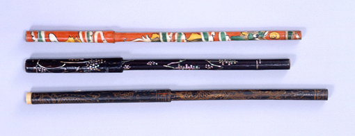 | 붓은 문화의 소산이고 인공적인 도구로 인간을 원시나 야만 상태에서 이끌어 내고 , 자연에서 구분해 내는 문화의 근원이라는 원형적인 상징성을 지니고 있다. 특히 동양의 유교적인 가치관에 있어서 文을 의미했던 모든 것의 으뜸에 붓이 자리잡게 되었다. 한국에서 붓은 학문 또는 벼슬을 나타낸다. 아이의 첫돌 상을 차릴때 여러 기물중에서 붓을 잡으면 장차 학문에 힘써 벼슬을 할 것으로 믿었다. 이 붓들은 자개로 만든 山水紋, 龍을 화각한 것, 雲龍紋을 금색으로 도안한 것이다.