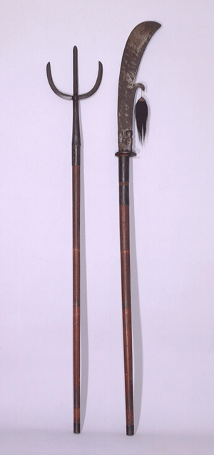 ¹«´çÀÌ ±ÂÀ» ÇÒ ¶§ »ç¿ëÇÏ´Â ¾ð¿ùµµÀÌ´Ù . ÀÌ ¾ð¿ùµµ´Â íâÏڱ°Ÿ®³ª ãêíâ°Å¸®¸¦ ÇÒ ¶§ ¹«´çÀÌ ãêÀÇ À§¾öÀ» »ó¡Çϱâ À§ÇÏ¿© ¼Õ¿¡ µé°í ÃãÃá´Ù. ÀÌ ¾ð¿ùµµ´Â ±æÀ̰¡ ¾ÆÁÖ ±ä ÇüÅ·Π³ª¹«ÀÚ·ç¿¡ 50§¯ Á¤µµÀÇ ¹Ý´ÞÇü ¼è³¯À» ¹ÚÀº Ä®ÀÌ´Ù.»ïÁöâÀº ¾ÆÁÖ ±ä ³ª¹«ÀÚ·ç¿¡ ¼¼ °¥·¡·Î µÈ ¼èâ»ì (»ïÁöâ)ÀÌ ¹ÚÈù °ÍÀÌ´Ù.