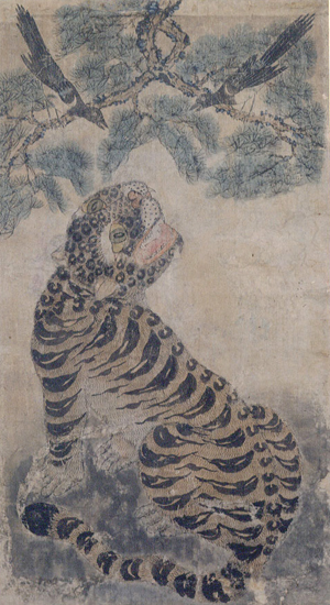 | È£¶ûÀÌ´Â Çѱ¹ÀÇ ¹ÎÈ¿¡¼ Áñ°Ü ±×¸®´ø ¼ÒÀç·Î È£¶ûÀÌ¿Í »ó¼·Î¿î ¼Ò½ÄÀ» ÀüÇÏ´Â ±îÄ¡¸¦ ÇÔ²² ±×¸° ±îÄ¡ ? È£¶ûÀ̱׸²(ûÛíÎÓñ)Àº º®»çÀÇ Àǹ̸¦ Áö´Ï°í ÀÖ´Ù. ¼Ò³ª¹« ¾Æ·¡ È£¶ûÀ̰¡ ¾É¾ÆÀÖ°í ±îÄ¡ µÎ ¸¶¸®°¡ ¼Ò³ª¹« À§¿¡ ¾É¾Æ¼ È£¶ûÀ̸¦ ÇâÇØ ÁöÀú±Í°í ÀÖ´Â ¸ð½ÀÀÌ´Ù. È£¶ûÀÌÀÇ ¸öÀº ´ÜÃàµÇ¾î ÀÖ°í ¾ó±¼Àº Ãø¸é°ú Á¤¸éÀÇ ¾ó±¼ÀÌ µ¿½Ã¿¡ Ç¥ÇöµÇ¾î ÀÖ´Ù. ÀÛÈ£µµ´Â ¡®»õÇØ¸¦ ¸Â¾Æ ±â»Û ¼Ò½ÄÀÌ ¿À´Ù(ãæÒ´ÜÃýì)¡¯¶ó´Â ¶æÀ» ´ã°í ÀÖÀ¸¸ç, ¿ô°í Àִ ȣ¶ûÀÌÀÇ ¸ð½À¿¡¼ Çѱ¹ÀÎÀÇ ÇØÇÐÀ» ¿³º¼ ¼ö ÀÖ´Ù.